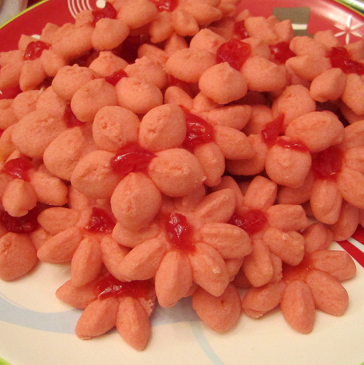 - Red Poinsettia Cookies: I chose the flower shape from my cookie press and inserted the red dough. After pressing out all of the cookies onto the cookie sheet, I then cut up maraschino cherries into small pieces and added a small piece of cherry to the middle of each cookie.