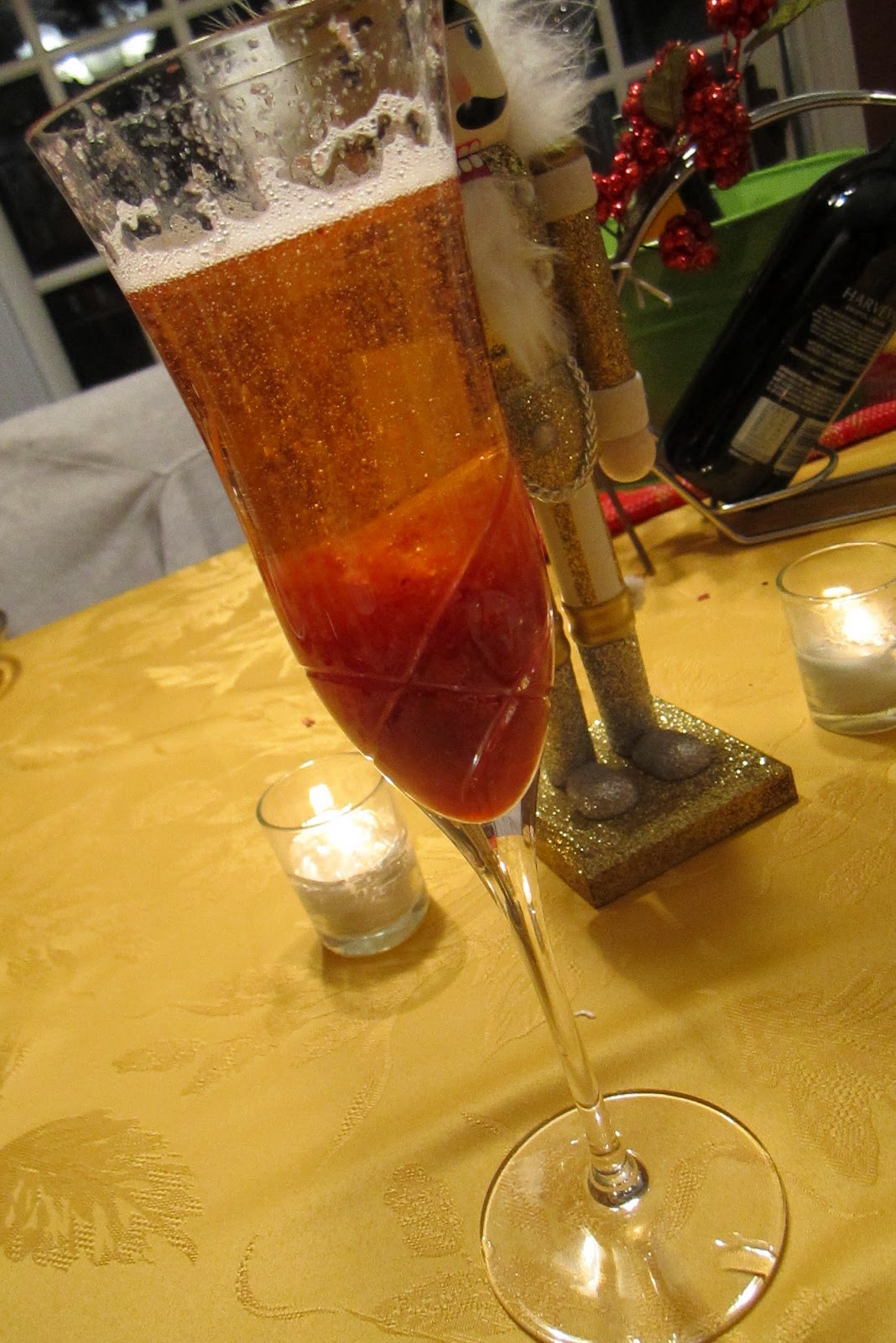 • Pour about an ounce of the strawberry syrup mixture into the bottom of champagne glasses.