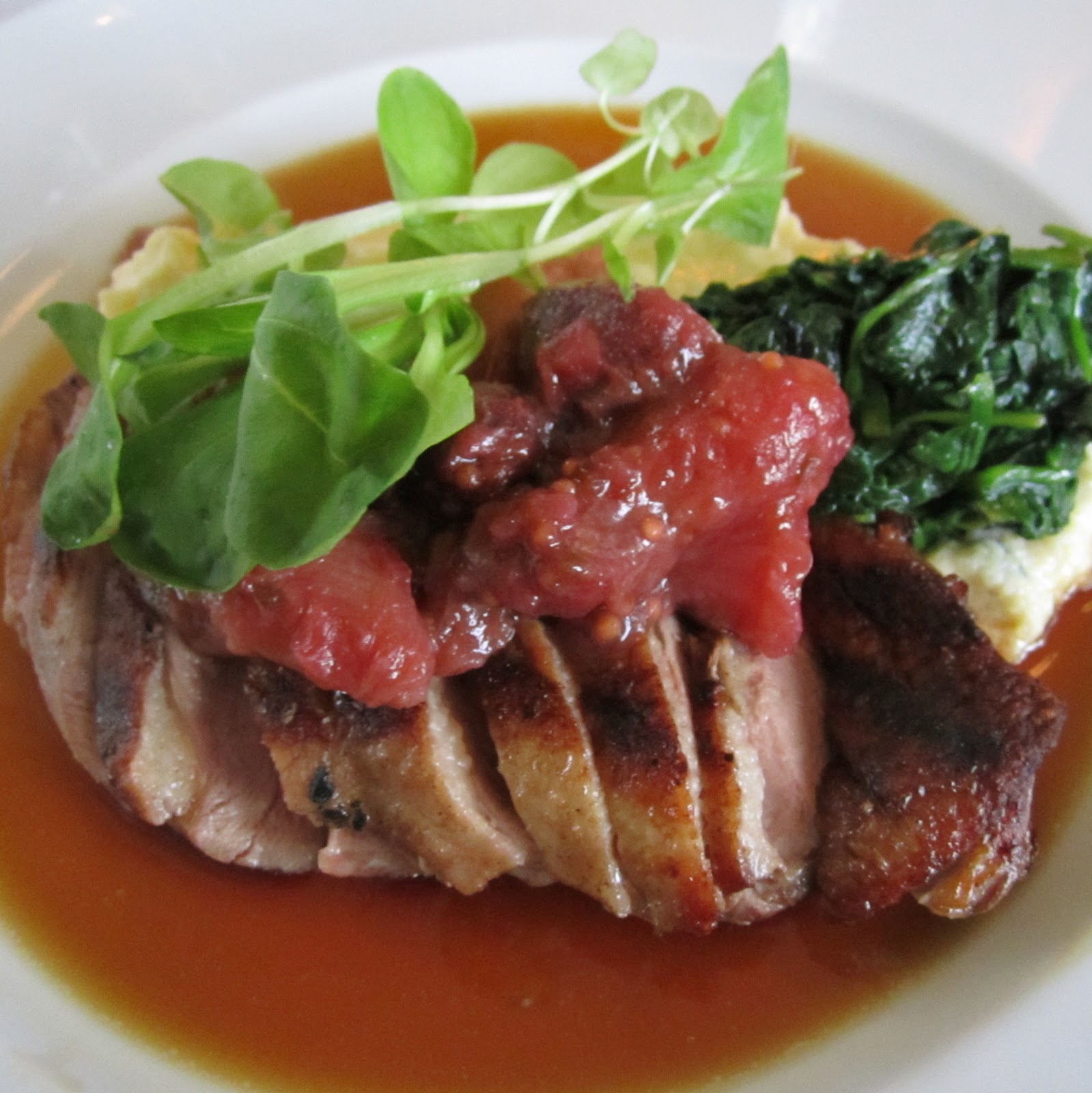 | My entree – Duck Breast with Strawberry Rhubarb Compote and served with Polenta and Spinach |