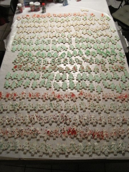 By the time I made the dough, baked the cookies, let them cool. cleaned up my mess, and got halfway through decorating them it was 3:00am! I was so exhausted at this point, that I actually ended up getting my younger sister out of bed and paid her to finish decorating them for me!!!!! Too bad for her that I’m married now…she could make some decent money from me this time of year if she lived with me!