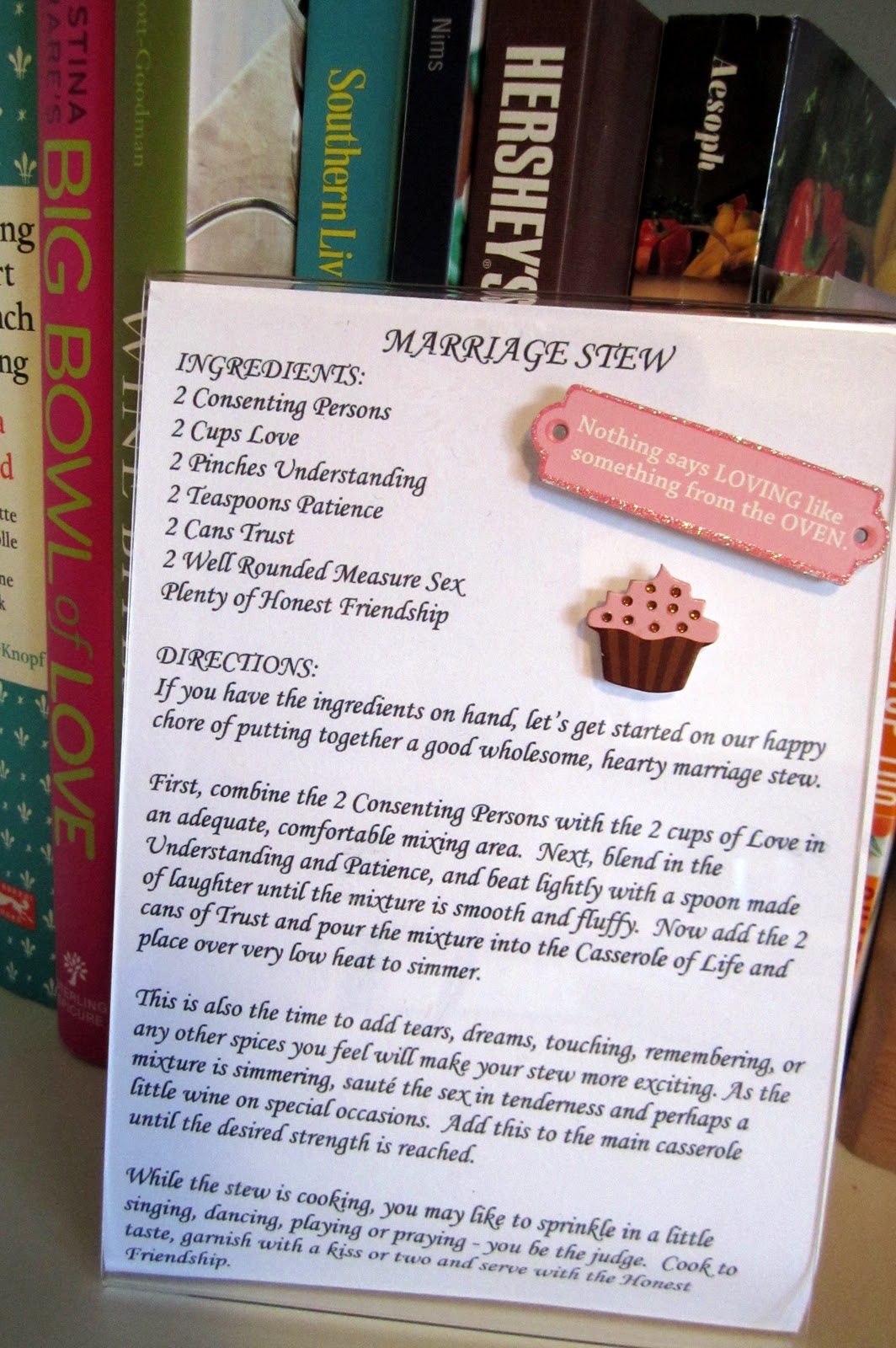 First, combine the 2 Consenting Persons with the 2 cups of Love in an adequate, comfortable mixing area. Next, blend in the Understanding and Patience, and beat lightly with a spoon made of laughter until the mixture is smooth and fluffy. Now add the 2 cans of Trust and pour the mixture into the Casserole of Life and place over very low heat to simmer.